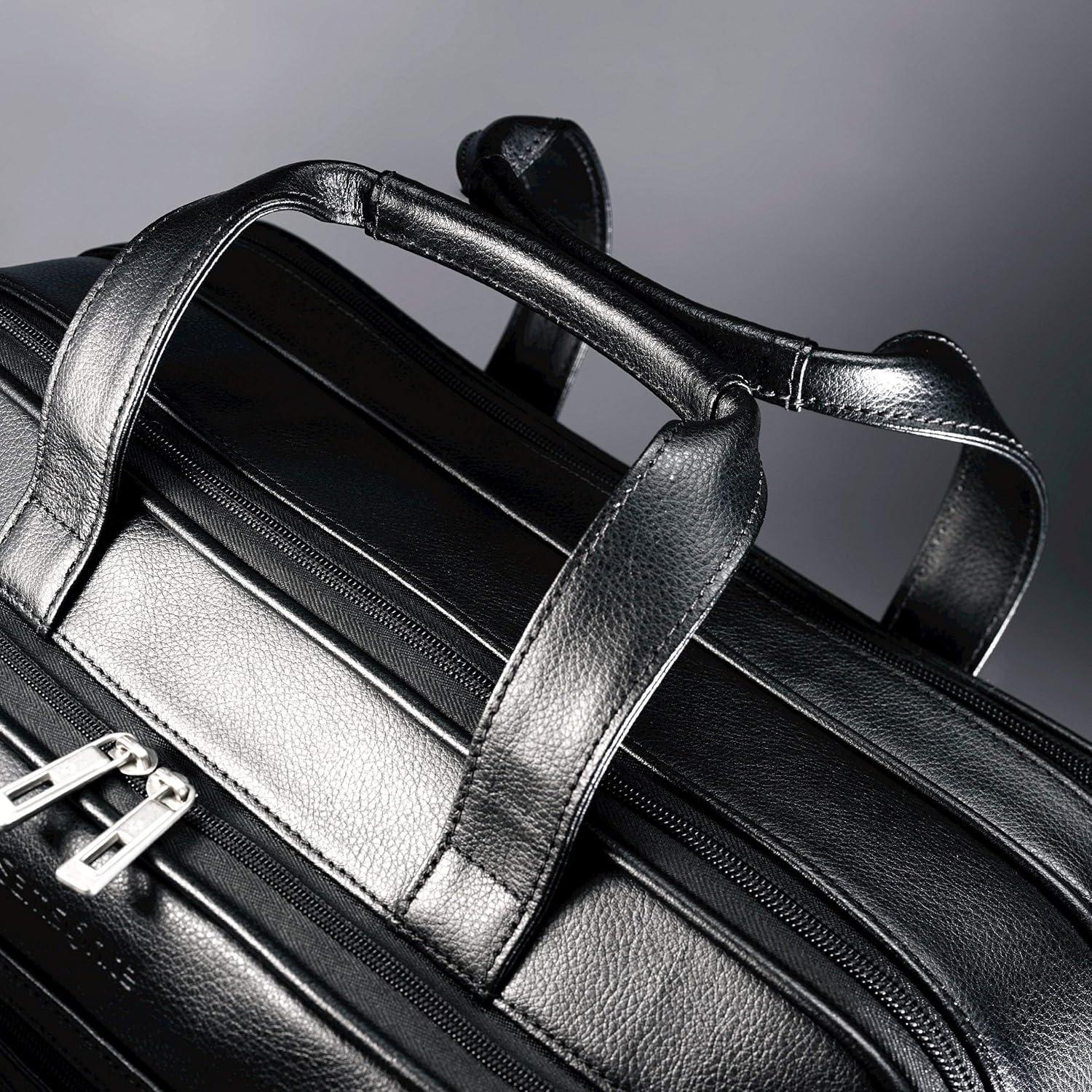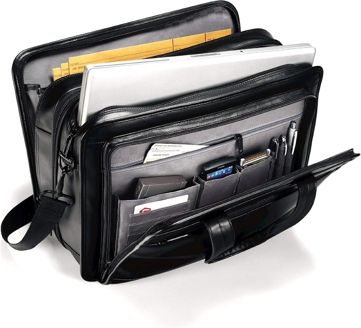 Crafted from genuine Leather, this bag is all business. Comfortable handles that support additional weight from additional files in the expandable compartment. Fits a 15.6 inches laptop computer. SmartPocket slides over upright handles for easy mobility. Body dimension: 16.75 x 12.25 x 7.25 inches.