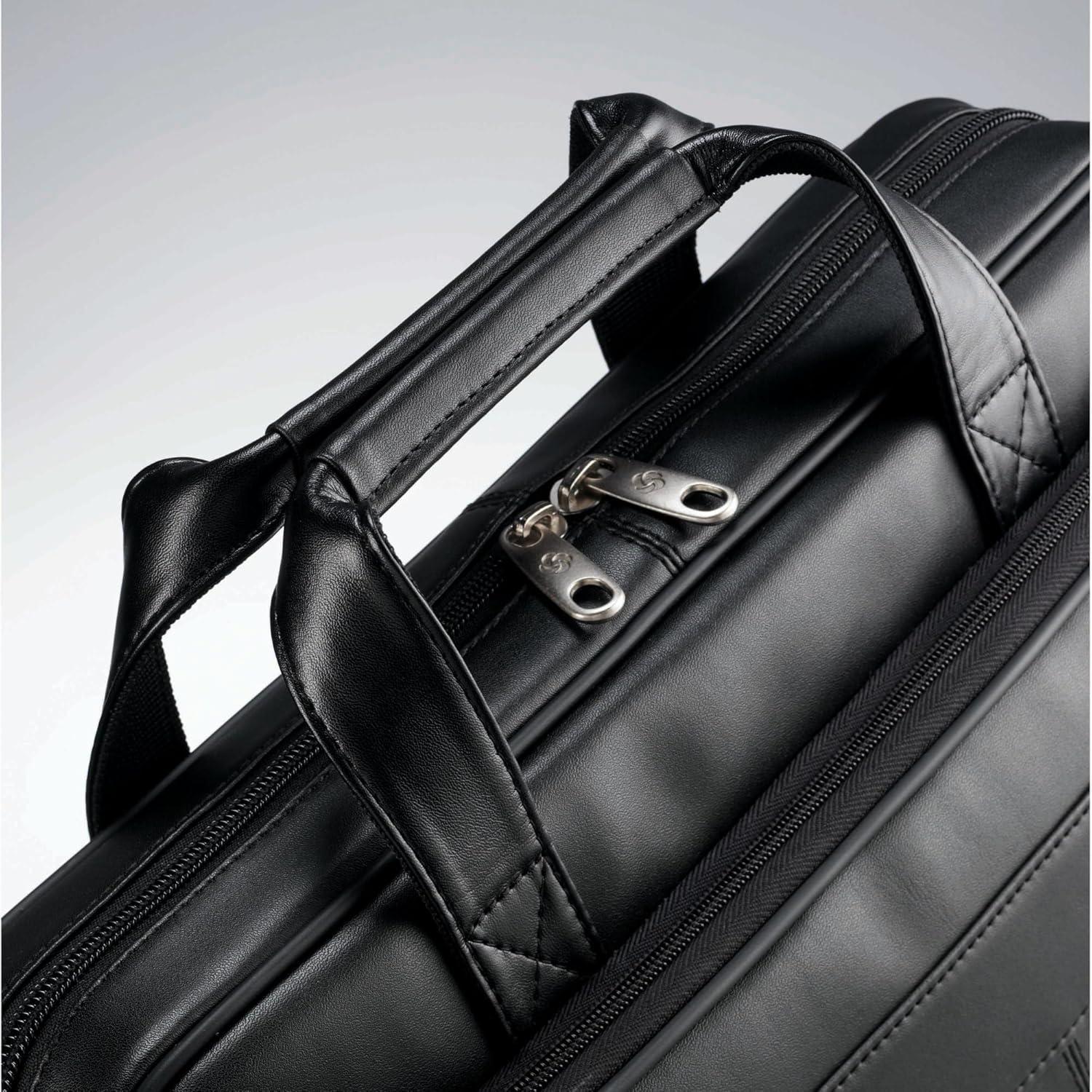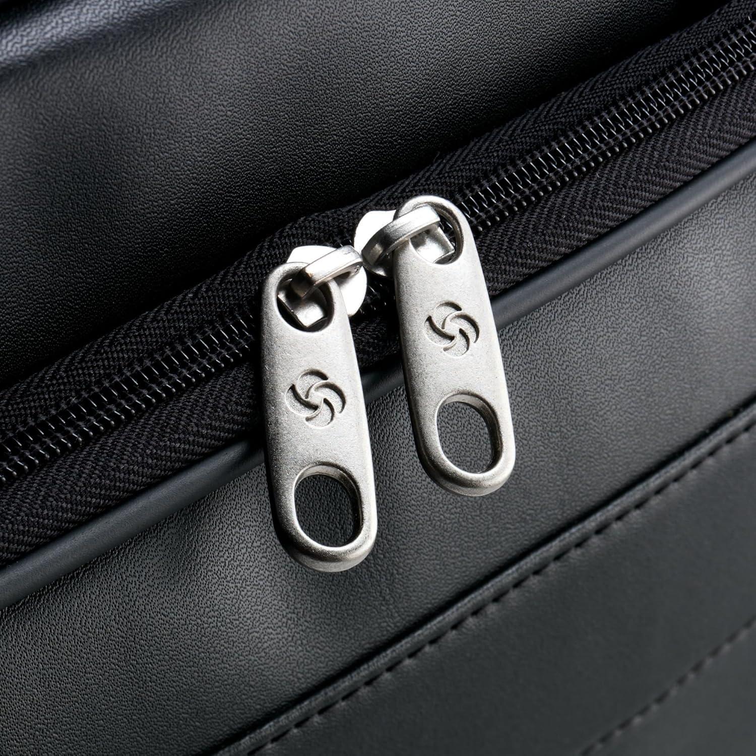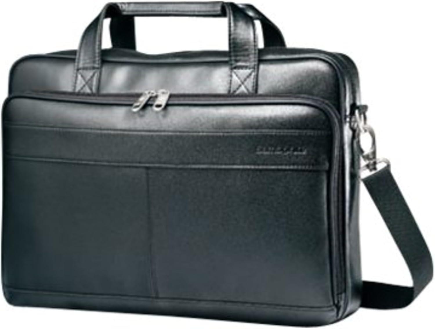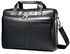 This Samsonite slim brief is crafted of genuine leather. It features a front, pocket organization for all of your business needs and padded, removable shoulder strap adjusts for convenience. The smart pocket slides over upright handles for easy mobility. Fits a 15.6″ Laptop computer. Body dimension: 15.75 x 11.6 x 2.5 inches, Overall Dimension: 15.75 x 11.6 x 2.5 inches.