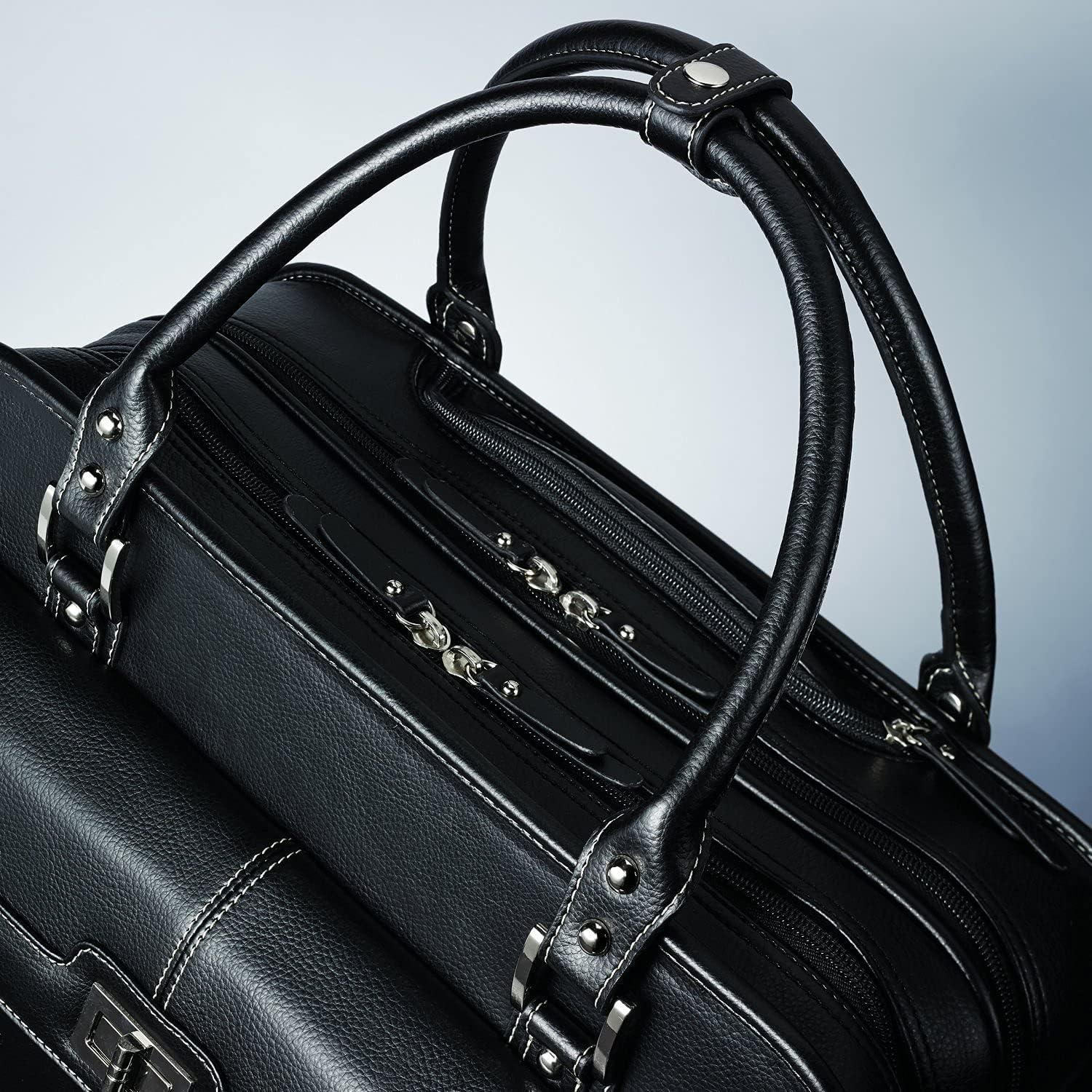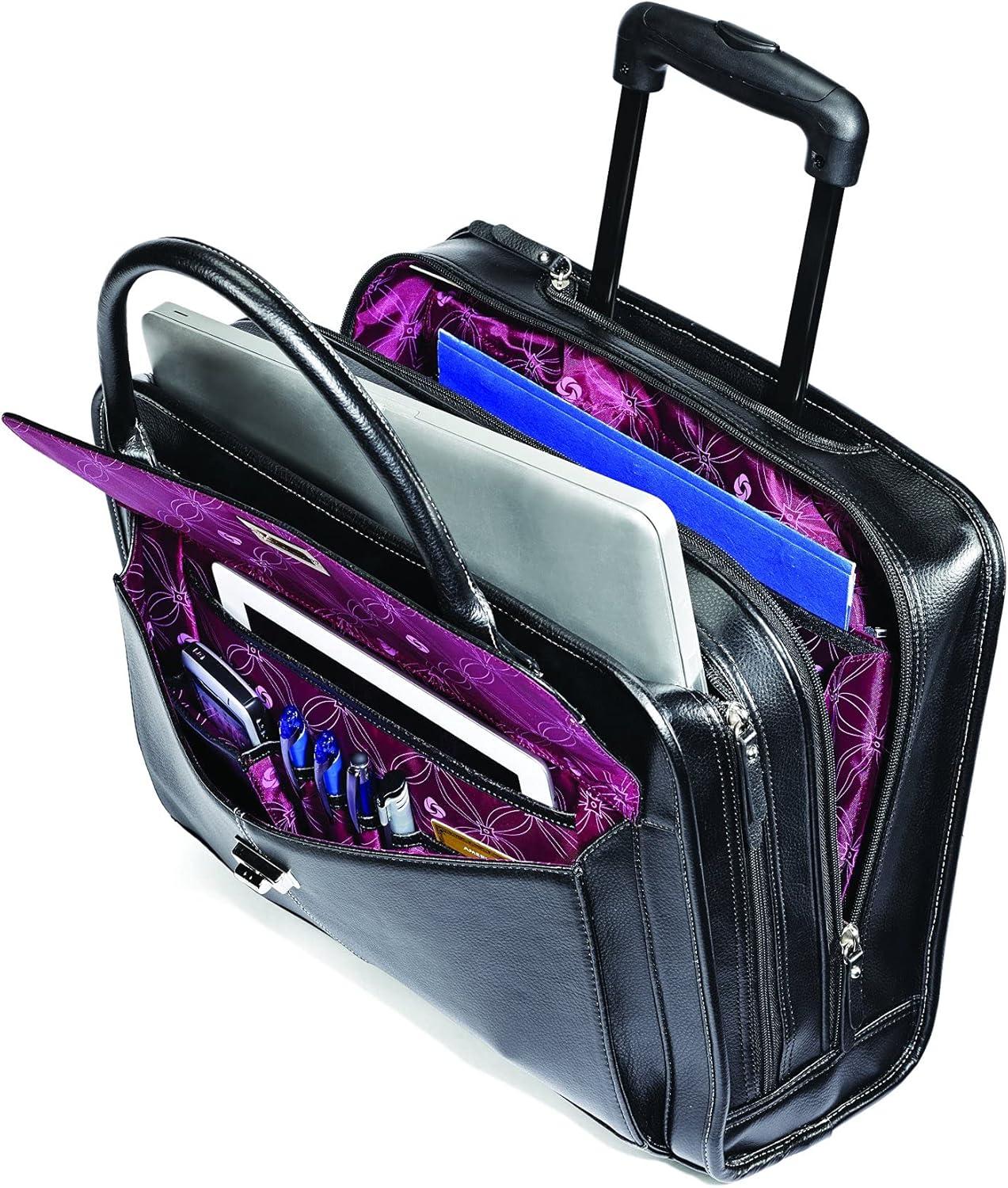 Carry your laptop and other essentials for the daily commute or business travel inside this chic mobile office from Samsonite. The Samsonite Women's Laptop Mobile Office is made from faux leather and features a sleek and stylish design with contrast accent stitching, two top handles for hand toting, a retractable pull handle, and smooth rolling wheels for easy mobility. This laptop case has a dual compartment design with a padded laptop pocket, a rear compartment to hold files and documents, and slip pockets to hold accessories. A separate front organizer compartment includes a pocket for your iPad or table, pen sleeves, and slip pockets to hold small personal items.